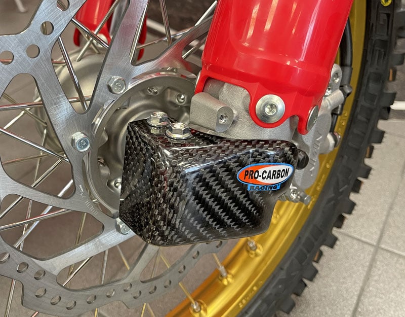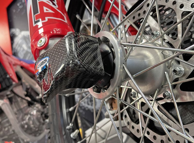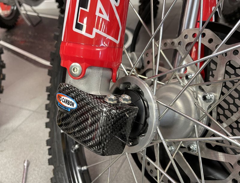 Tough protection for the bottom of your fork legs. Super thick impact resistant carbon. Works perfectly with our super tough Front Disc Guards.